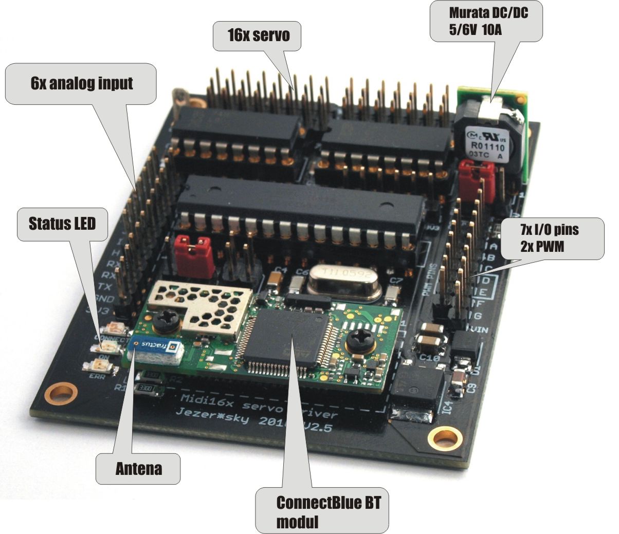 Pro rozhýbání 12ti serv byl použitý právě Midi 16x s ATMega168